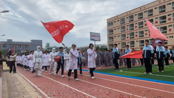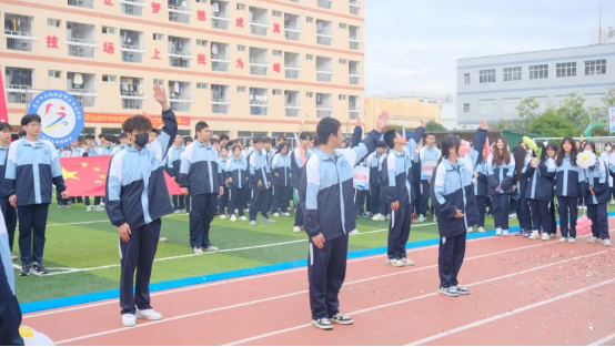 上午八點,伴隨著雄壯的音樂,在主持人的指引下,國旗班的同學(xué)們護衛(wèi)著莊嚴(yán)的國旗,走在入場方陣的最前列。他們踏著堅定的步伐,面帶笑容,精神抖擻,盡情展現(xiàn)著新時代青少年學(xué)子堅韌頑強的精神和熱情澎湃的活力。