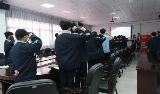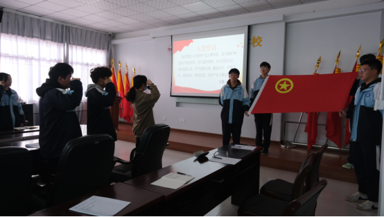 會(huì)議最后,全體團(tuán)員高舉右手,緊握右拳,在團(tuán)旗下重溫入團(tuán)誓詞。