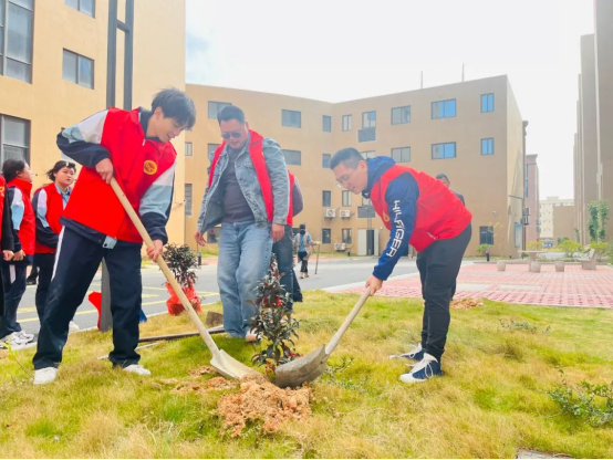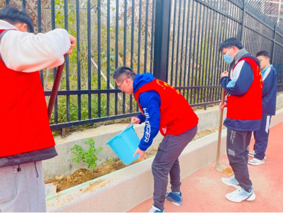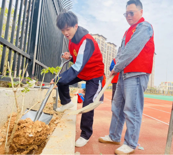 青年志愿,為綠充“植”。師生齊聚,相互協(xié)作,個(gè)個(gè)干勁十足,解袋、扶苗、填土、施肥、澆水,將一棵棵充滿生機(jī)和希望的小樹植入大地,校園呈現(xiàn)出一派熱火朝天的勞動(dòng)景象。