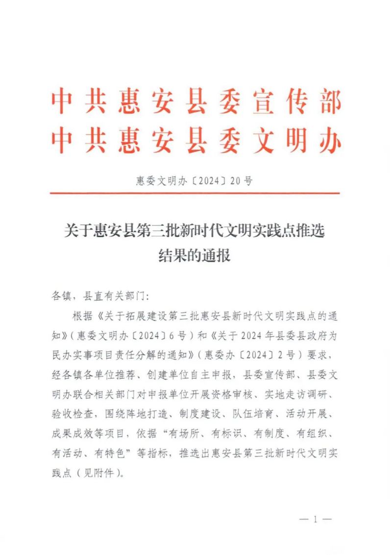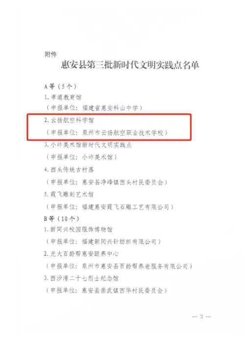 近日,中共惠安縣委宣傳部、中共惠安縣委文明辦聯(lián)合相關部門圍繞陣地打造、制度建設、隊伍培育、活動開展成果成效等項目對申報單位開展資格審核、實地走訪調(diào)研、驗收檢查,在全縣遴選出35個新時代文明實踐點,其中A級5個,B級10個,C級20個,我校云揚航空科學館入選惠安縣第三批A級新時代文明實踐點!
