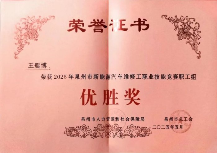 近日,2025年泉州市新能源汽車維修工職業(yè)技能競賽圓滿落幕,本次競賽由泉州市人社局、市總工會聯(lián)合主辦,旨在實(shí)施“技能泉州”行動,加快培養(yǎng)和選拔適應(yīng)新能源汽車產(chǎn)業(yè)發(fā)展需求的高技能人才。比賽按照《汽車維修工》三級國家職業(yè)標(biāo)準(zhǔn)組織,我校智能網(wǎng)聯(lián)汽車技術(shù)應(yīng)用專業(yè)的王艇博老師,憑借專業(yè)的態(tài)度和出色的臨場發(fā)揮,在眾多參賽高手中嶄露頭角,榮獲第四名的佳績!