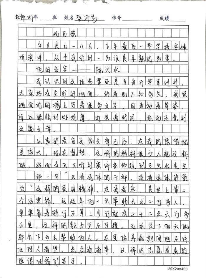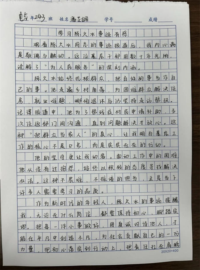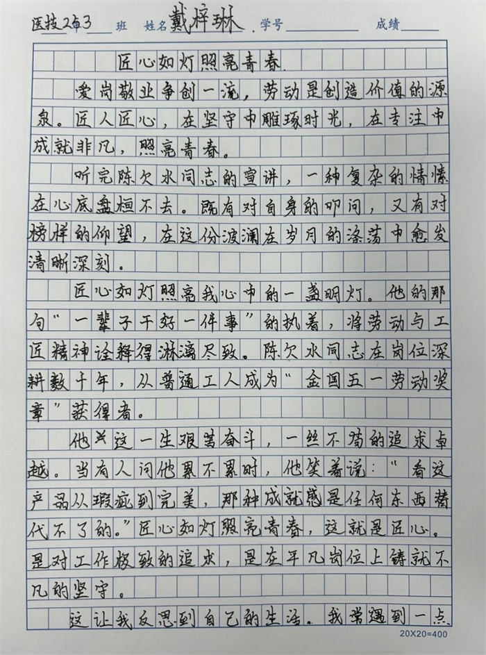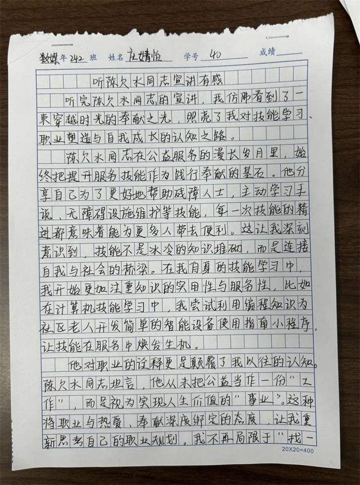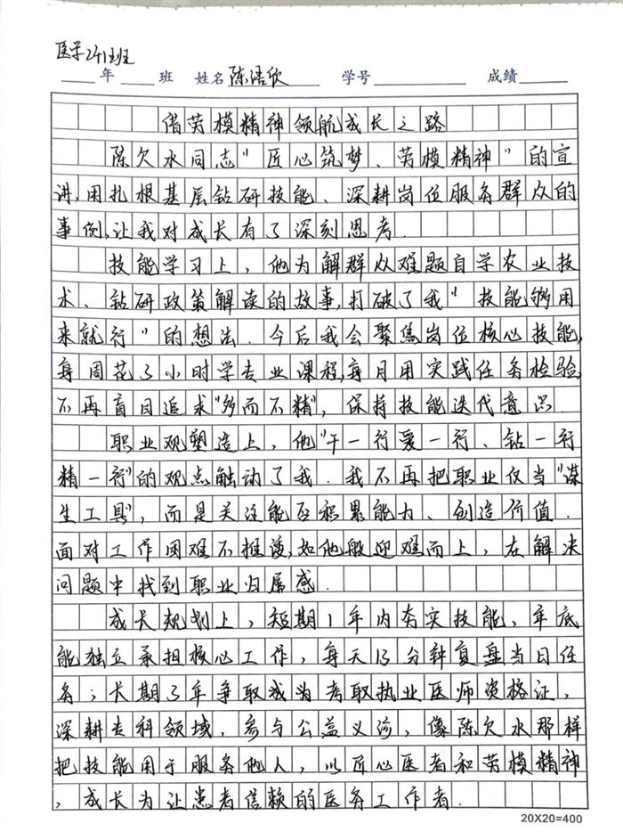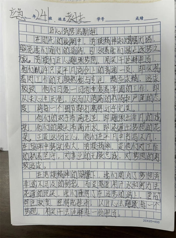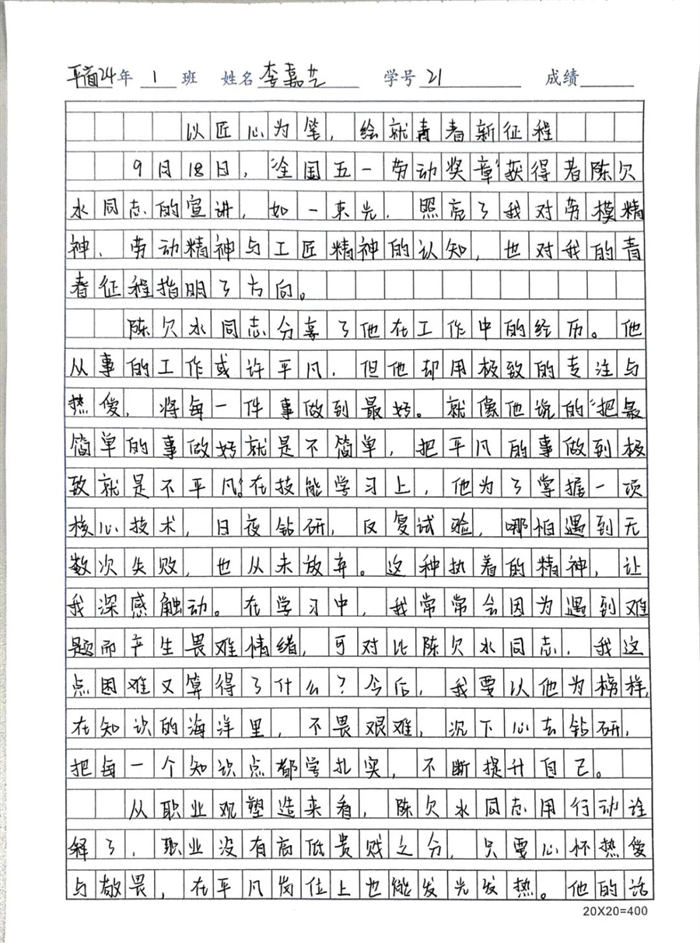 為深化學(xué)習(xí)成效,讓勞模精神真正融入育人全過程,學(xué)校同步啟動(dòng)“勞模精神照我心”主題征文比賽,鼓勵(lì)學(xué)生結(jié)合聆聽感受與自身實(shí)際,暢談對(duì)勞動(dòng)價(jià)值、青春擔(dān)當(dāng)?shù)乃伎?。比賽得到各年?jí)積極響應(yīng),共收到來稿30余篇,同學(xué)們用文字書寫敬意、抒發(fā)志向,紛紛表示要以陳欠水同志為榜樣,刻苦學(xué)習(xí)、服務(wù)社會(huì),讓奮斗成為青春最亮麗的底色。