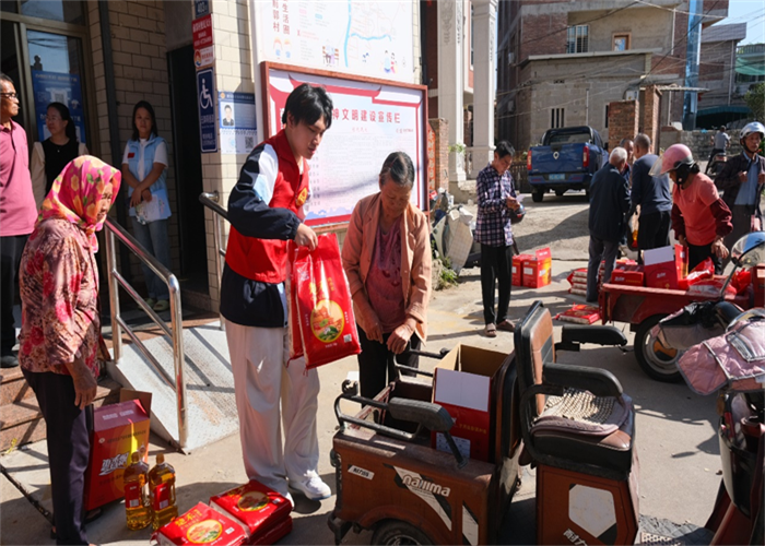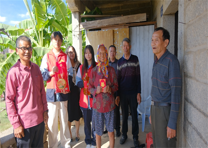 前郭村委會(huì)廣場(chǎng)上早已人聲鼎沸,舞蹈與煙花交織出濃濃的節(jié)日氣氛。人群中,我校志愿者們的身影格外醒目。他們俯身與老人交談,細(xì)心遞上物品,認(rèn)真傾聽(tīng)他們的家常,關(guān)切詢問(wèn)健康狀況與生活起居,將青年一代的敬意與關(guān)懷,化作一句句溫暖問(wèn)候,傳遞到每位老人心中。