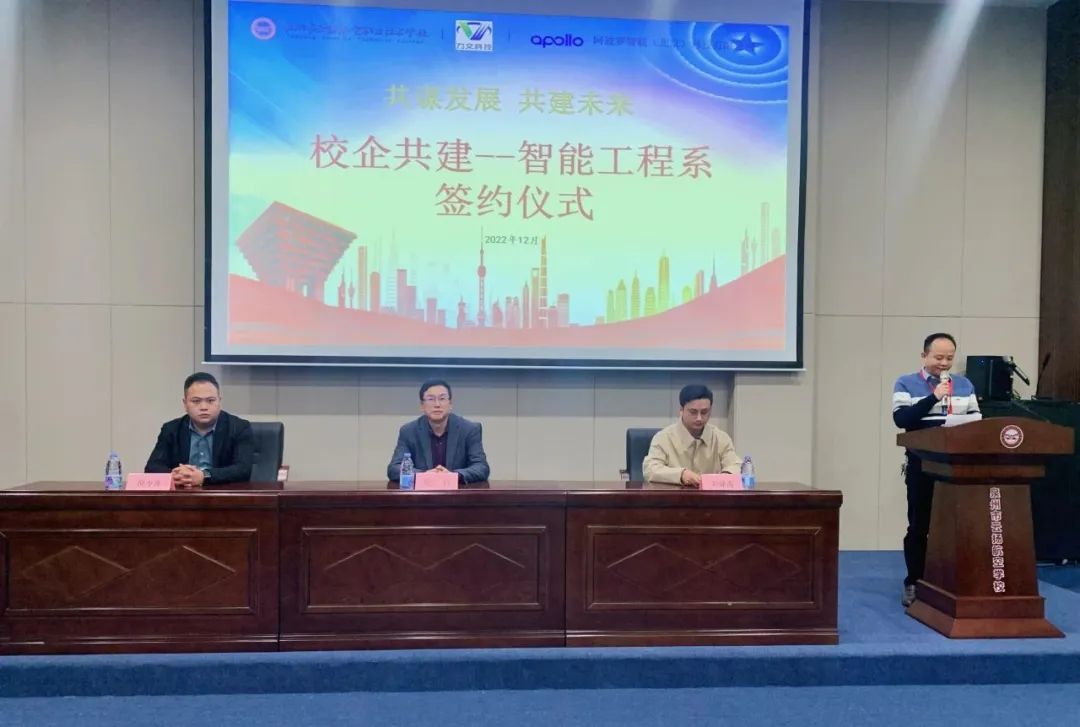 2022年12月21日下午,泉州市云揚航空職業(yè)技術學校、力文科技(福建)有限公司、阿波羅智聯(lián)(北京)科技有限公司在我校學術報告廳進行校企共建智能工程系簽約儀式。我校遲巖校長、力文科技(福建)有限公司總經(jīng)理劉建清、百度智能交通福建區(qū)域城市總經(jīng)理倪少澤等領導及其他來賓出席了本次簽約儀式,我校杜成達常務副校長主持儀式。